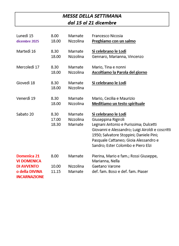 Messe e celebrazioni CELEBRAZIONI DELLA SETTIMANA La Segreteria Parrocchiale 15 Dicembre 2025 Continue Reading Previous Addio a papa Francesco More Stories Messe e celebrazioni Addio a papa Francesco La Segreteria Parrocchiale 24 Aprile 2025
